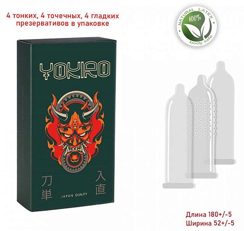 - Регистрационное [~DETAIL_TEXT] => Презервативы YOKIRO ассорти - гладкие классические (4 шт), точечные (4 шт), тонкие (4 шт). Номинальная ширина - 52+/-2 мм.