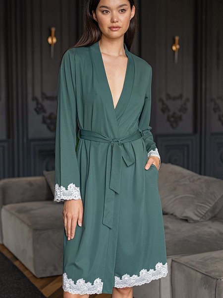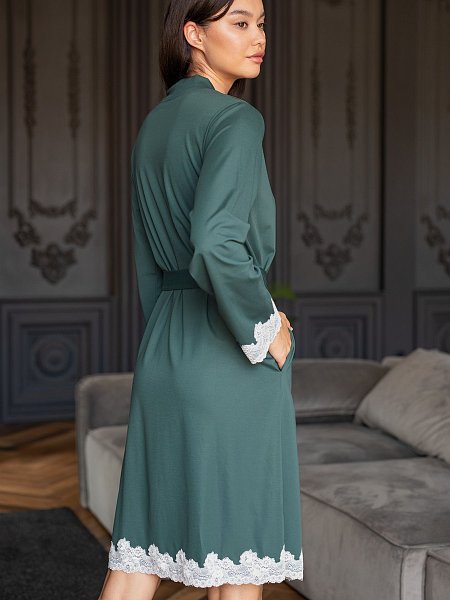 Женский домашний халат из роскошной приятной к телу ткани, содержащей вискозу и тенсел. Универсальная длина миди и модель на «запАх» подойдет всем. Халат поддерживается поясом и внутренней завязкой. По подолу и низу рукавов украшен ажурной кружевной аппликацией молочного цвета.