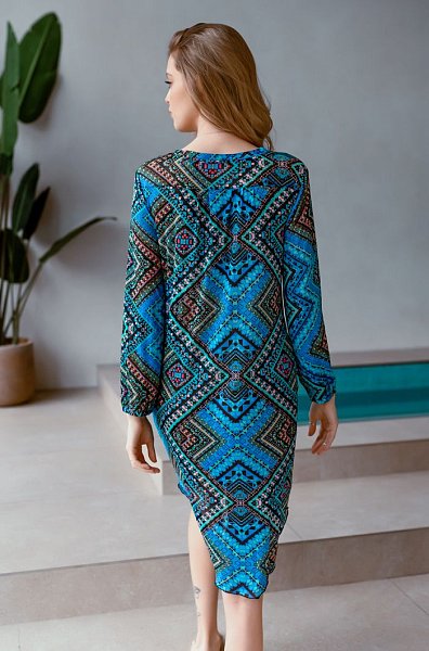 Туника пляжная женская выполнена из эластичной сетки с ярким принтом. Модель прямого силуэта средней длинны. Длинный рукав на манжете с резинкой. Спинка на кокетке со складками по центру. В боковых швах туники карманы. Горловина и низ рукавов обработаны обтачкой из эластичной однотонной сетки. Фигурный вырез горловины подчеркнут кантом. Подол туники обработан швом-краевкой.
