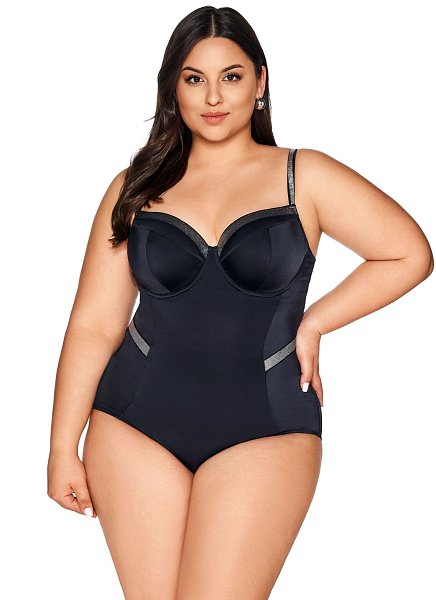 Купальник совместный выполнен с мягким лифом, на запах, с внутренней стороны спереди купальник продублирован сеткой, к лифу пришиты поролоновые вкладыши, под грудью корректирующая резинка, широкие бретели разгружают позвоночник, а блестки в виде блестящих лент добавили костюму легкости и элегантности.