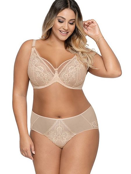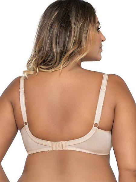 Бюстгальтер на косточках, чашки мягкие, шитые из сетки телесного цвета и чёрного кружева, бретельки не отстёгиваются, регулируются по длине, в зоне декольте несъёмные декоративные бретели. На спине застёжка на удлинитель, количество крючков в ряду увеличивается в зависимости от размера.