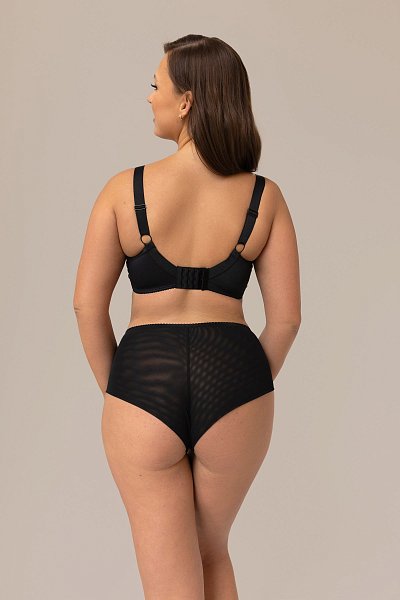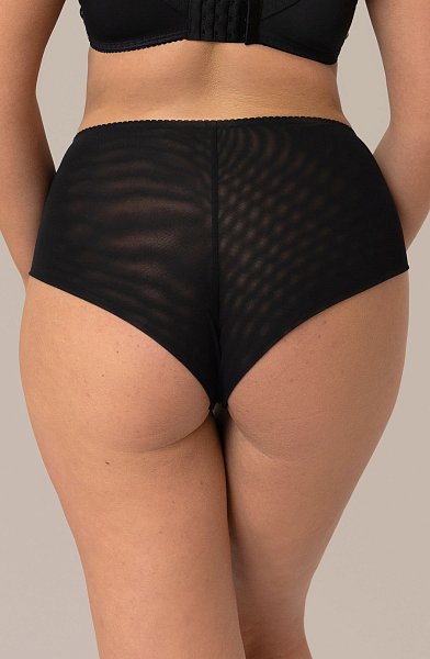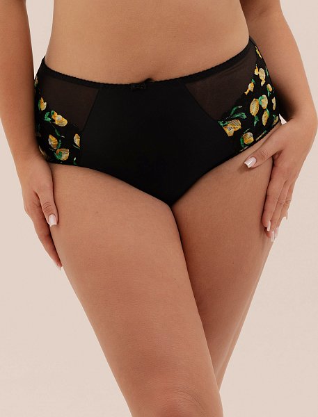 Женские трусики-бразилиана спереди выполнены из микрофибры, по бокам вставки из гипюра с принтом в виде лимончиков, продублированы черной сеткой, спинка из сетки, сложенной вдвое, ластовица проложена 100% хлопком. Идеальный вариант для повседневной носки.