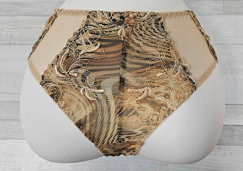 Женские трусики выполнены из сетки с принтом, с вышивкой бежевой нитью и люрексом, спинка из сложенной вдвое телесной сетки, ластовица проложена 100% хлопком. Идеальный вариант для повседневной носки.