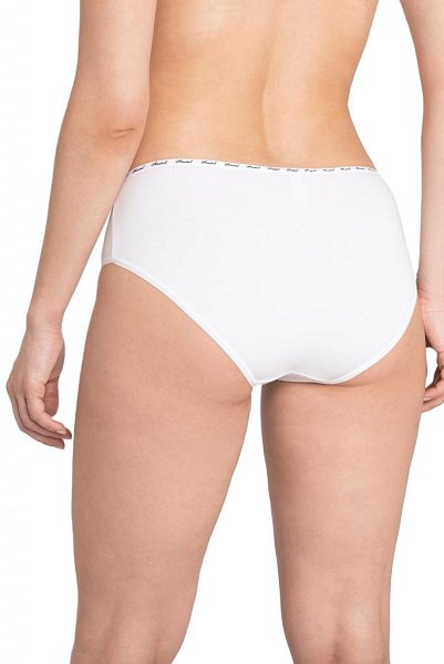 Трусы-слипы со средней линией талии, с широким бочком, выполнены из однотонного хлопкового плотна. Для обработки талии использована узкая декоративная резинка с контрастным логотипом. Хлопковая ластовица.